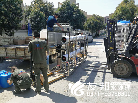 這套型號為YB-CJS-005,每小時出水5噸的單級水處理設備是發往新鄉的,工人們冒著炎炎夏日正在裝車發貨。
