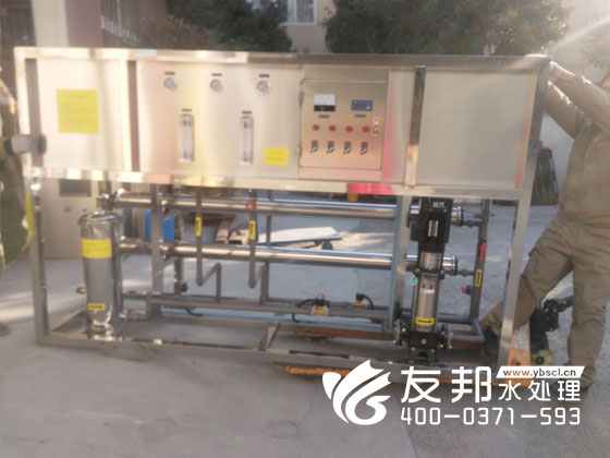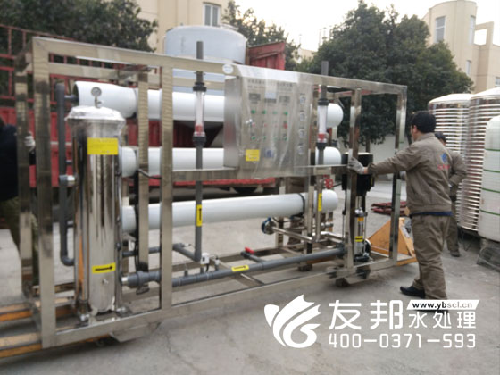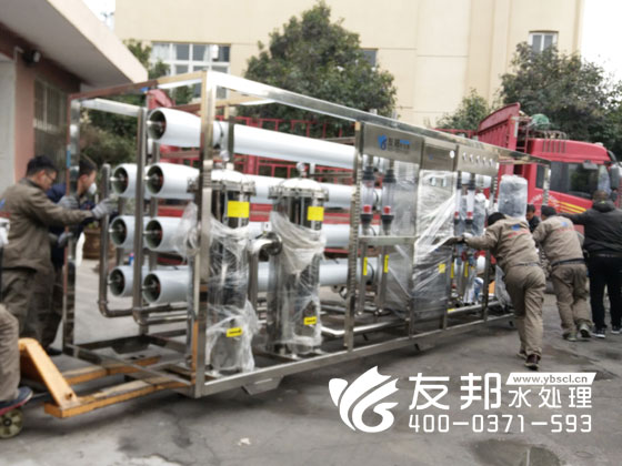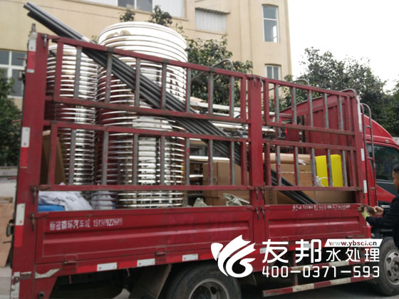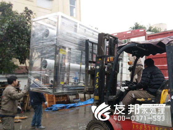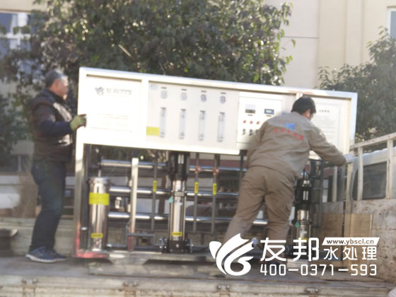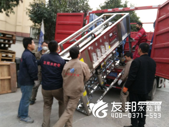 師傅們正在裝車發貨的是鄭州友邦生產的型號為YB-CJS-002的2噸純凈水設備。這套設備是用在鄭州高新區機械廠的生產用水。