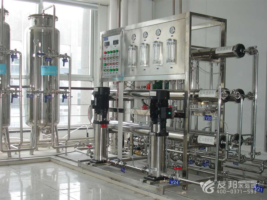 2、預處理→一級反滲透→加藥機(PH調節)→中間水箱→第二級反滲透(正電荷反滲膜)→純水箱→純水泵→EDI裝置→紫外線殺菌器→0.2或0.5μm精密過濾器→用水對象(≥17MΩ.CM)