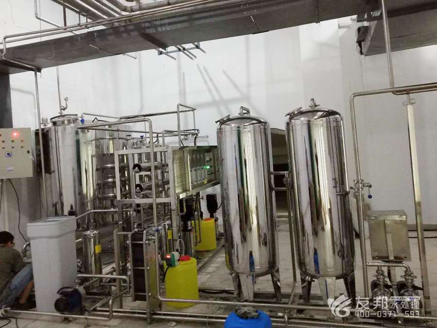地下水或自來水——原水增壓泵——石英砂過濾器——活性炭過濾器——加藥裝置——精密過濾器——一級高壓泵——一級反滲透——二級高壓泵——二級反滲透——水箱——成品水