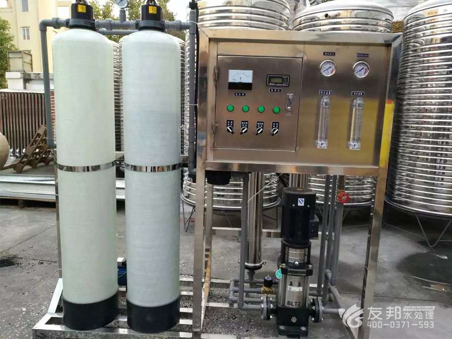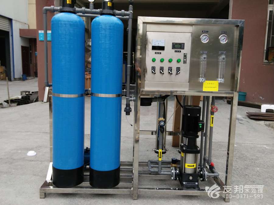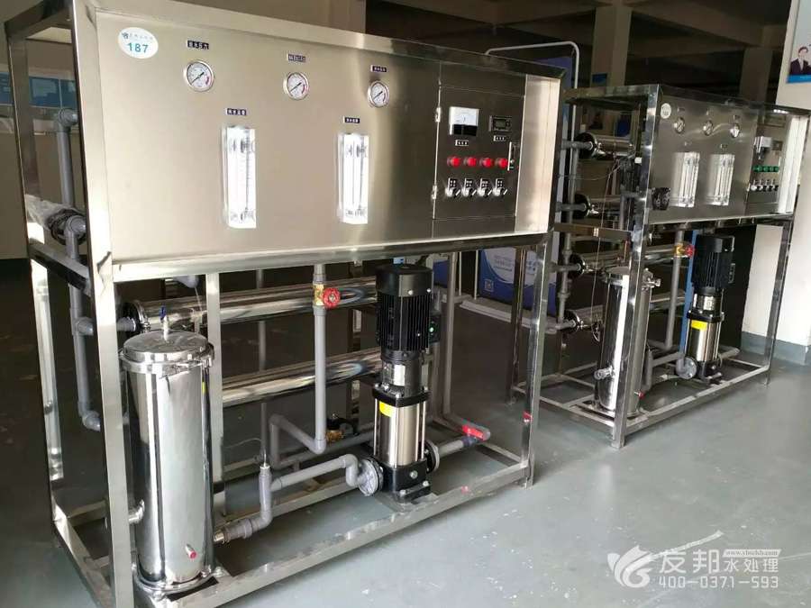 1、原水→原水加壓泵→多介質(zhì)過(guò)濾器→活性炭過(guò)濾器→阻垢裝置→精密過(guò)濾器→一級(jí)反滲透→中間水箱→中間水泵→陰陽(yáng)離子交換器→純化水箱→純水泵→紫外線(xiàn)殺菌器→微孔過(guò)濾器→用水點(diǎn)
